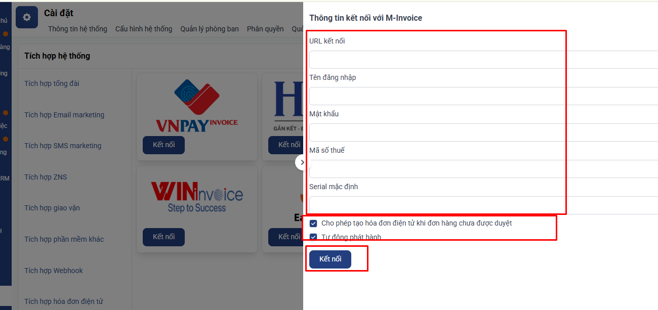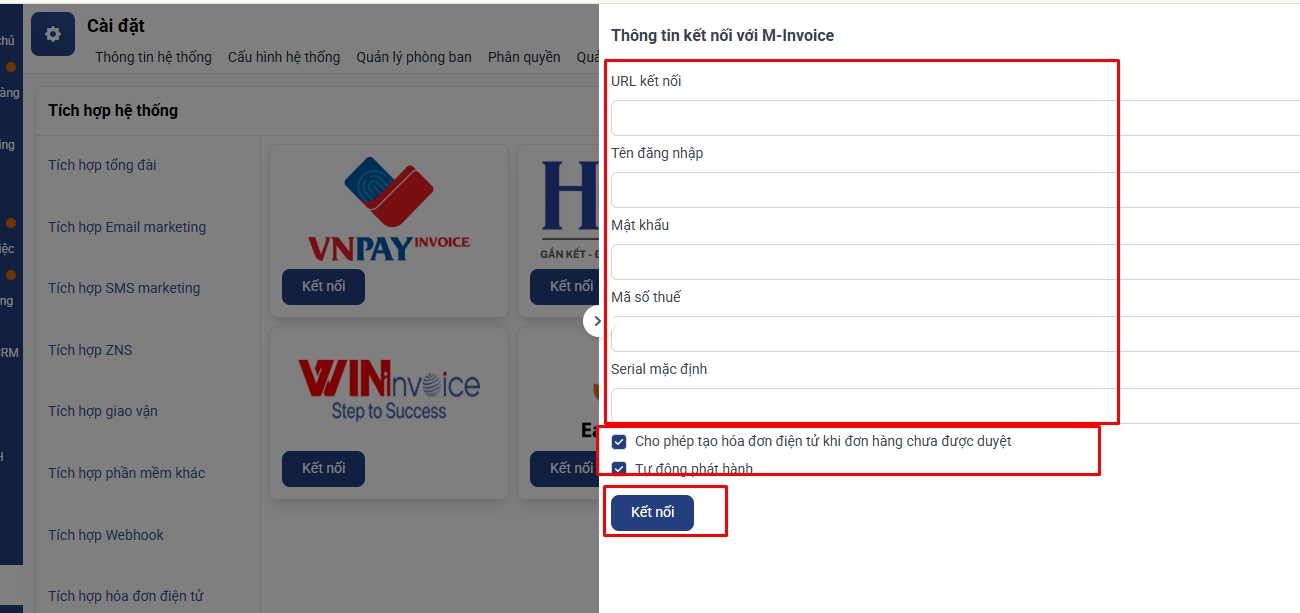 Bước 2: Điền các thông tin kết nối do bên M-Invoice cung cấp Lưu ý : Lựa họn các tuỳ chỉnh + Cho phép tạo hoá đơn khi đơn hàng chưa duyệt ▪ Khi tắt: Đơn hàng được duyệt thì mới hiển thị nút Tạo hoá đơn trong đơn chi tiết đơn hàng ▪ Khi bật: Nút bấm Tạo hoá đơn sẽ được hiển thị cả khi đơn hàng chưa được duyệt + Tự động phát hành ▪ Khi tắt: Hoá đơn điện tử chưa được ký số và ở trạng thái chưa phát hành ▪ Khi bật: Hoá đơn điện tử được đối tác ký số và phát hành.