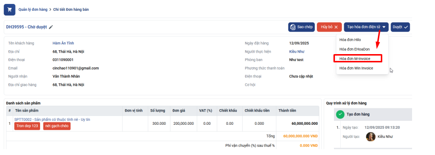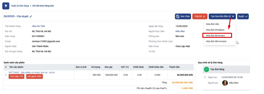 Các bạn vào chi tiết đơn hàng bán => ấn nút tạo hóa đơn điện tử và chọn hóa đơn M-Invoice