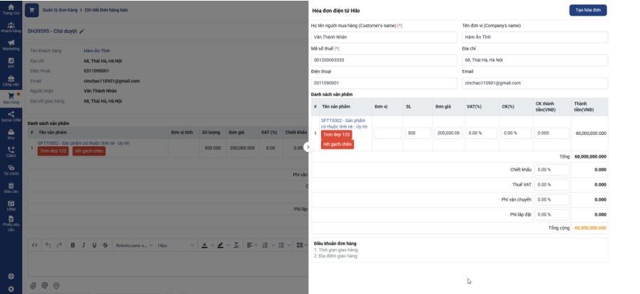 Thông tin đơn hàng sẽ tự điền vào màn hình thêm mới hoá đơn bao gồm + Tên Công ty sẽ được điền Tên khách hàng + Tên Người mua sẽ được từ điền Tên Người nhận trong đơn hàng + Mã số thuế sẽ được lấy trong thông tin khách hàng + Địa chỉ sẽ được lấy từ Địa chỉ giao hàng trong đơn hàng