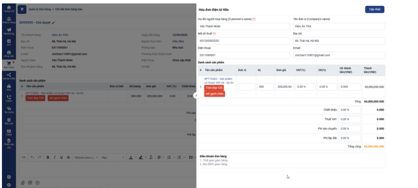- Sau khi tạo hóa đơn thành công hệ thống sẽ hiển thị trong chi tiết đơn hàng mã hóa đơn và trạng thái hóa đơn