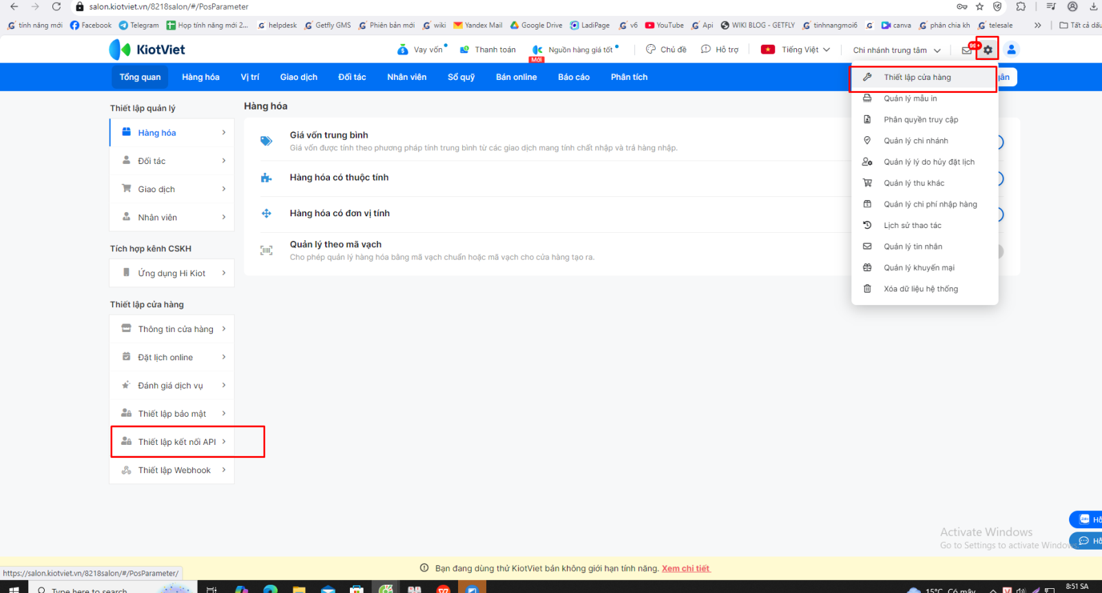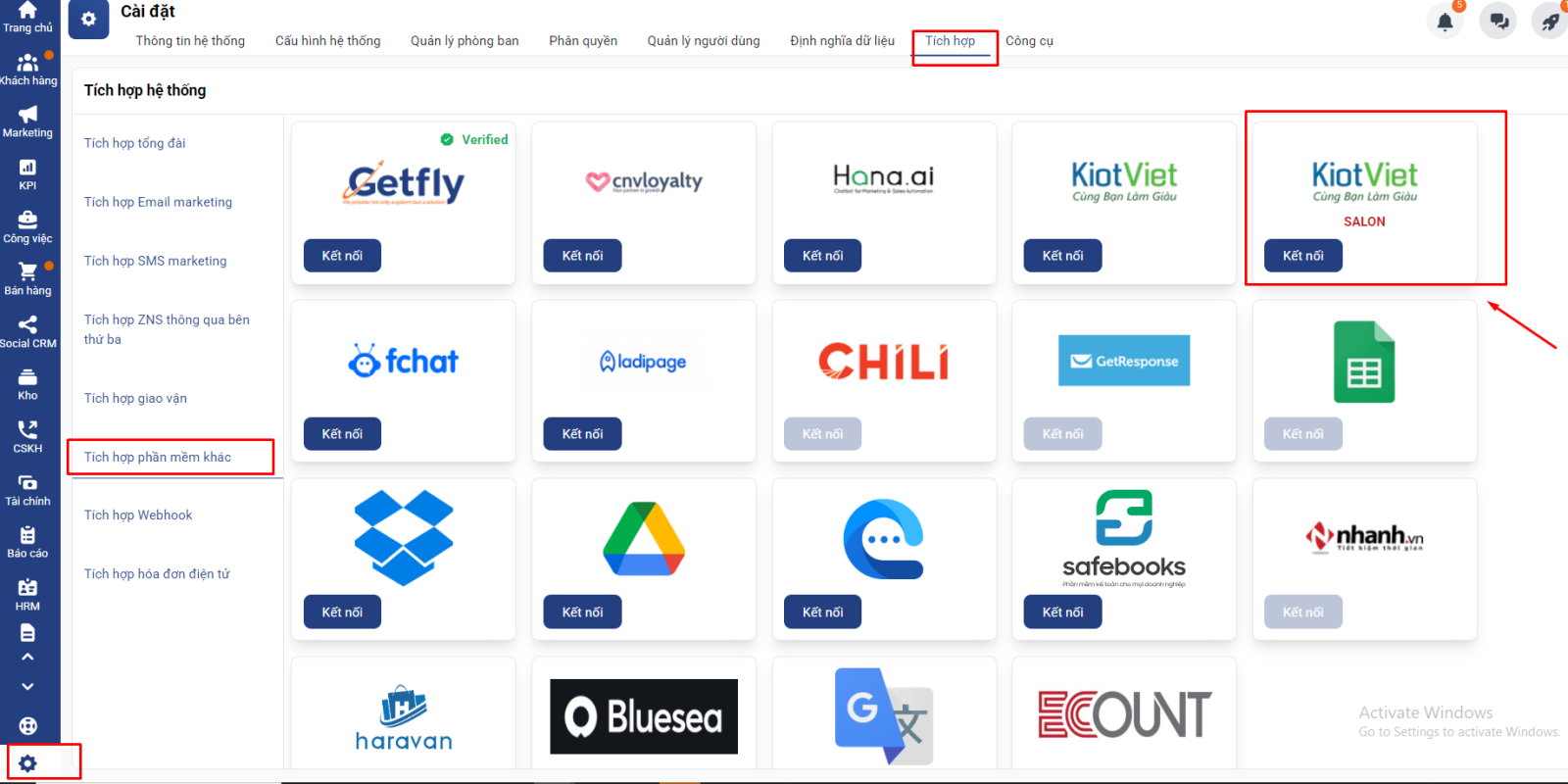 Truy cập Cài đặt → Tích hợp → Tích hợp phần mềm khác → chọn Kiot Việt Salon