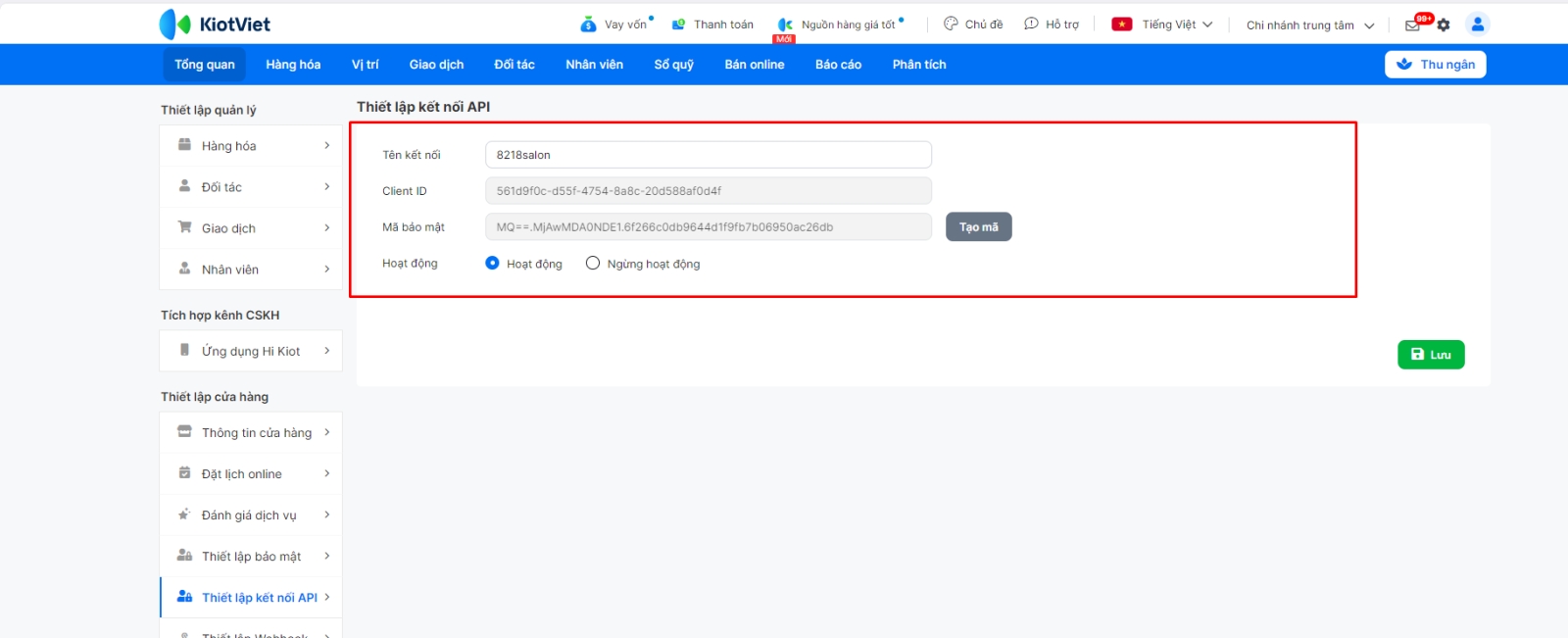 Bước 2. Tạo các thông số để cấu hình trên KiotViet