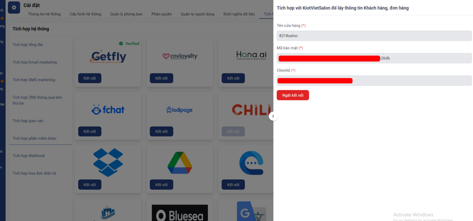 Copy các thông số tương ứng từ đã tạo từ KiotViet qua CRM rồi ấn kết nối
