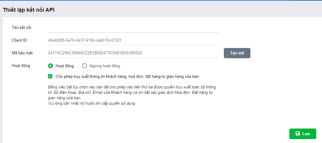 - Bạn lưu ý nhớ tích chọn vào mục "Cho phép truy xuất thông tin khách hàng, hóa đơn, đặt hàng từ gian hàng của bạn." thì các thông tin từ kiotviet mới đổ về Getfly.