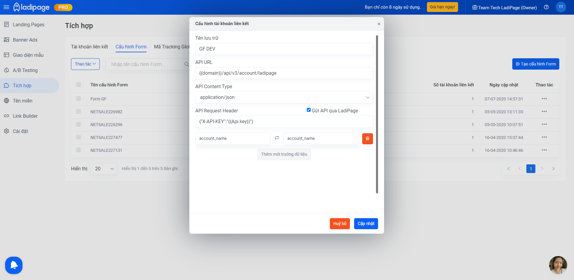 API URL: có dạng domain/api/v3/account/ladipage