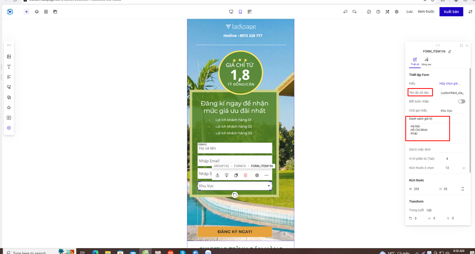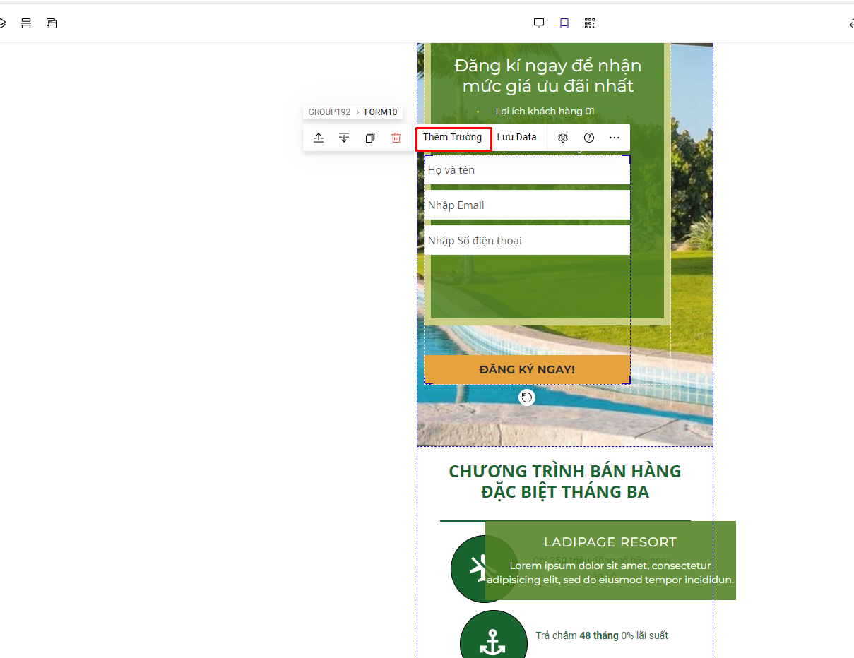 Truy cập vào trang ladipage -> chọn Landingpage -> chọn form cần chỉnh sửa để thiết lập thông tin tên lấy dữ liệu của từng trường trong form đăng ký