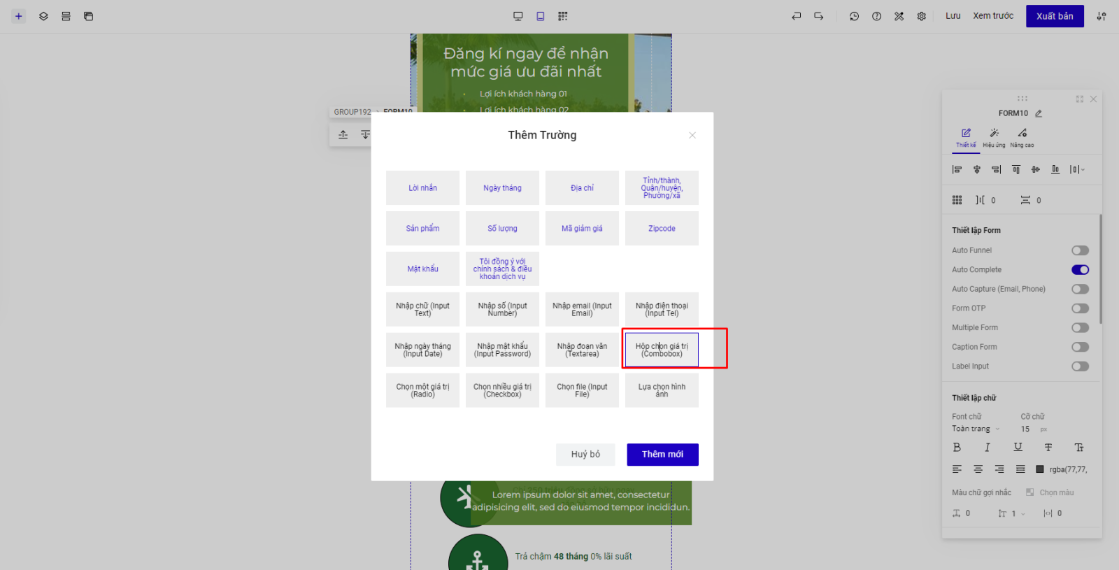 Bước 2: Anh/chị thêm trường data => chọn Hộp chọn giá trị => Thêm mới