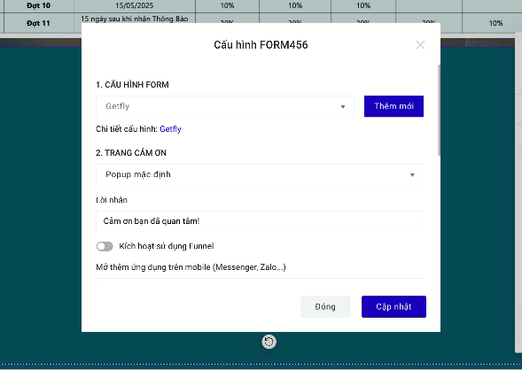 Sau khi cài đặt Form Ladipage bạn thao tác chọn Lưu data -> Chọn cấu hình Form tích hợp cho Form đang cài đặt -> Cập nhật theo hướng dẫn sau:
