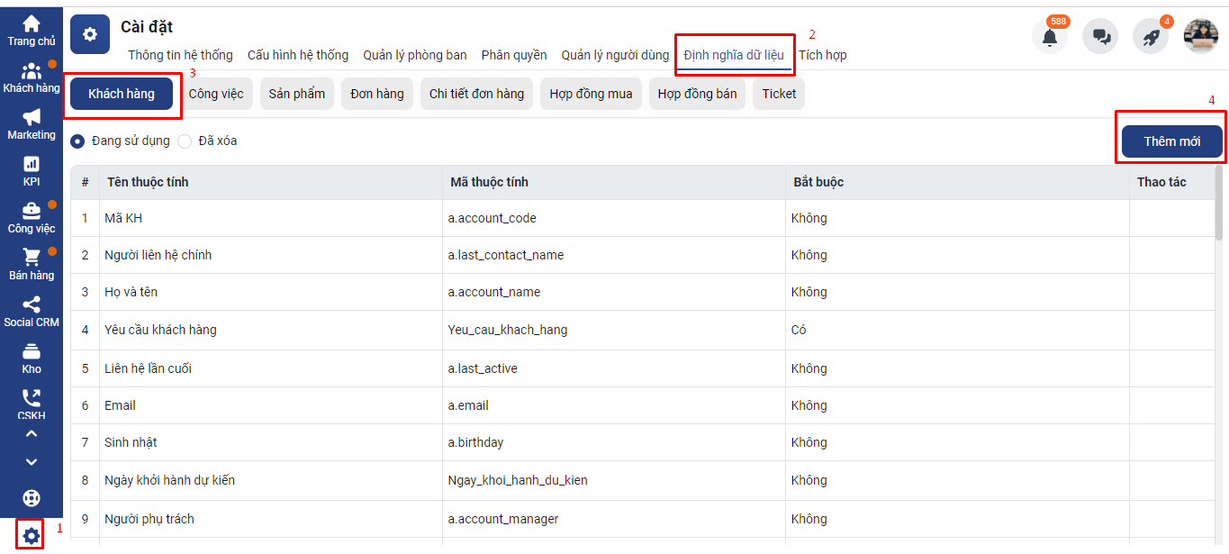 Bước 1: Thiết lập dạng dữ liệu select list trên Getfly: Anh/chị vào cài đặt => định nghĩa dữ liệu => thêm mới trường dữ liệu muốn đổ thông tin về Getfly dạng select list => thêm mới