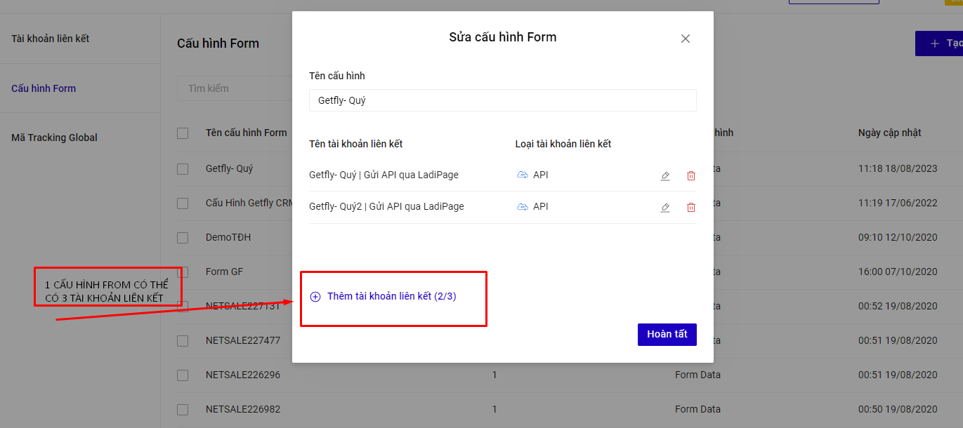 Mỗi 1 cấu hình Form có thể tạo tối đa 3 tài khoản liên kết -> Có nghĩa 1 Form của Ladipage có thể đổ thông tin về 3 hệ thống Getfly