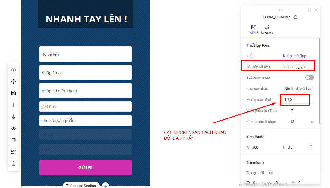 Bước 3: Thiết lập form: