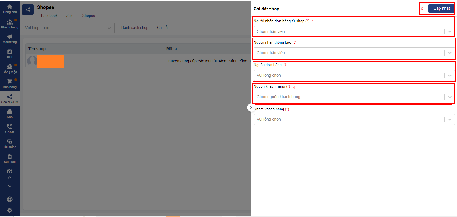 4. Nguồn khách hàng (Trường bắt buộc): Chọn nguồn khách hàng cho các khách hàng đổ về từ Shoppe (có thể chọn được nhiều nguồn khách hàng)