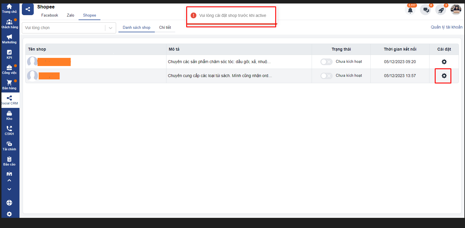 Để có thể kích hoạt shop bạn phải thiết lập các kết nối. Bạn thao tác vào mục cài đặt ( hình bánh răng cưa nằm bên phải tên shop) và thiết lập các thông tin liên quan