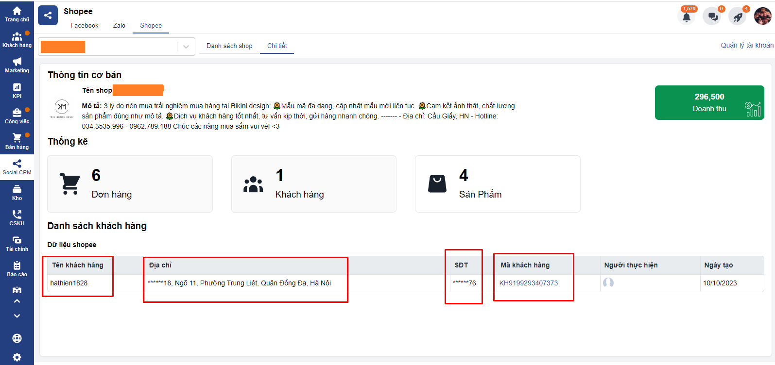 Các thông tin khách hàng sẽ đổ về từ Shoppe là: Tên khách hàng, Địa chỉ, Số điện thoại trên đơn hàng, mã khách hàng theo mã khách hàng trên Getfly. Tuy nhiêu Shoppe không cho phép đẩy dữ liệu khách hàng, nên SĐT và địa chỉ đều được mã hóa bới dấu sao và chỉ hiện trong mục khách hàng của Shoppe. Khi khách hàng thêm mới trong mục khách hàng của Getfly sẽ chỉ hiện tên khách hàng