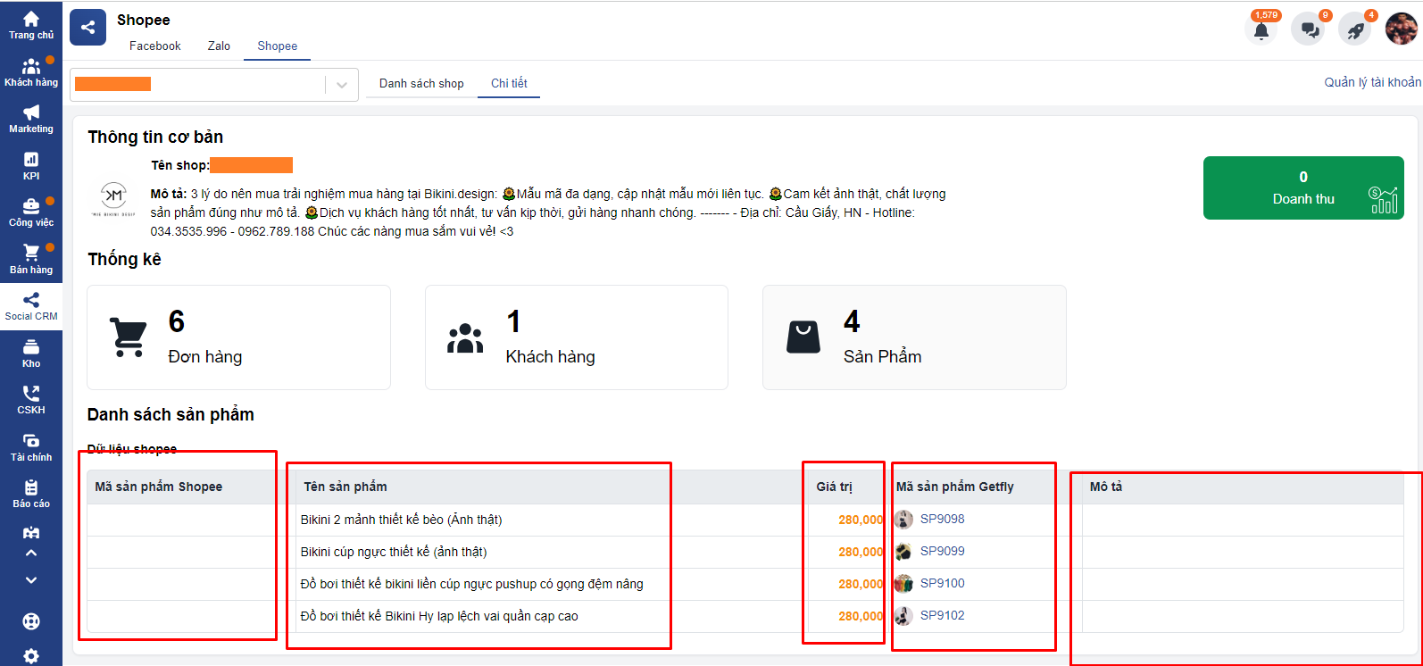 3. Thông tin kết nối giữa Shoppe và Getfly