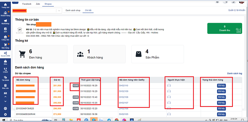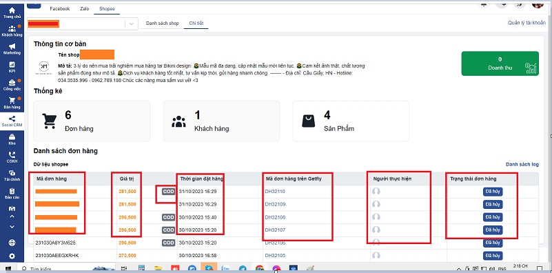 - Doanh thu đơn hàng sẽ tính các đơn Shoppe trừ đơn hủy - tính theo trạng thái đơn hàng trên Getfly