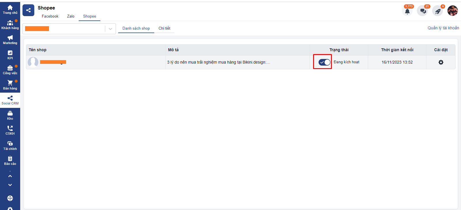 - Để ngắt kích hoạt, bạn thao tác vào mục Danh sách shop => Chọn shop muốn ngắt kích hoạt và nhấn Button ở mục trạng thái để ngắt kích hoạt