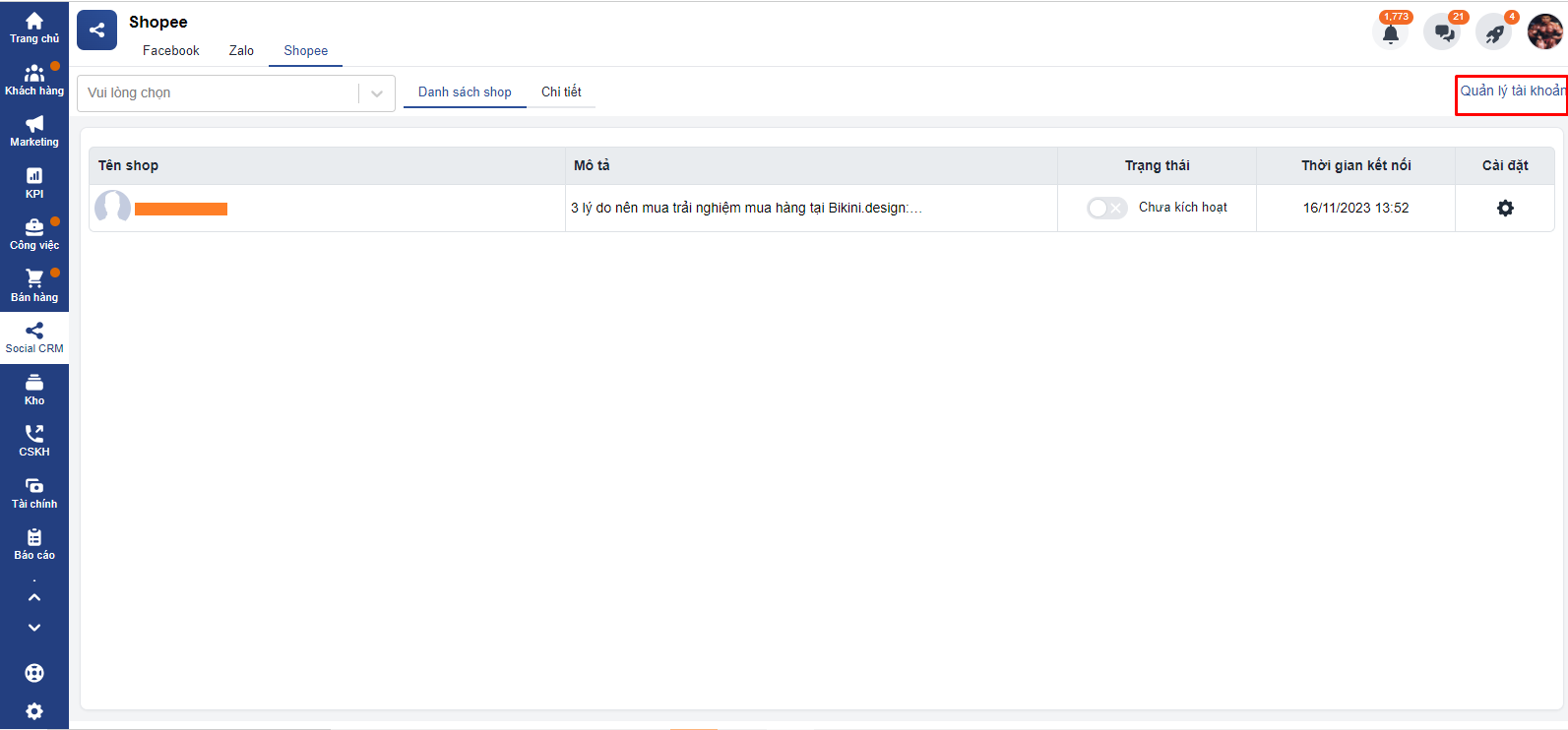 - Tích hợp được nhiều tài khoản Shoppe và nhiều shop trong một tài khoản Shoppe vào Getfly.