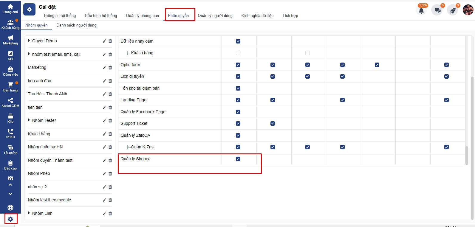 - Trên Getfly, để kết nối với Shoppe, bạn cần được phân quyền Truy cập của mục Quản lý Shoppe