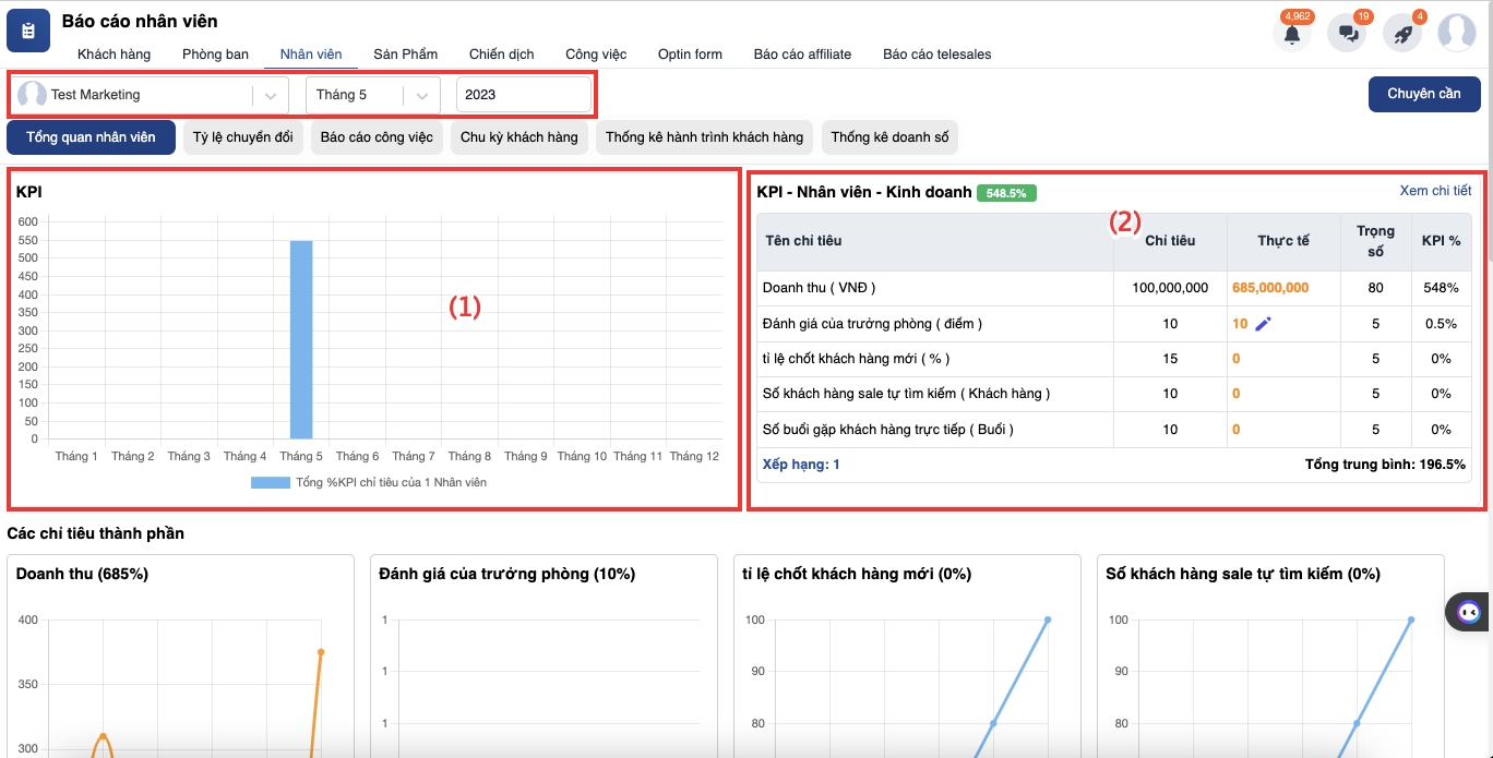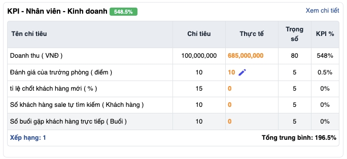 Nếu bạn có thiết lập KPI cho nhân viên thì ở phần Tổng quan này hệ thống sẽ hiển thị KPI của nhân viên đó. . Ví dụ ở đây tôi dang xem trong tháng 5/2023 của nhân viên