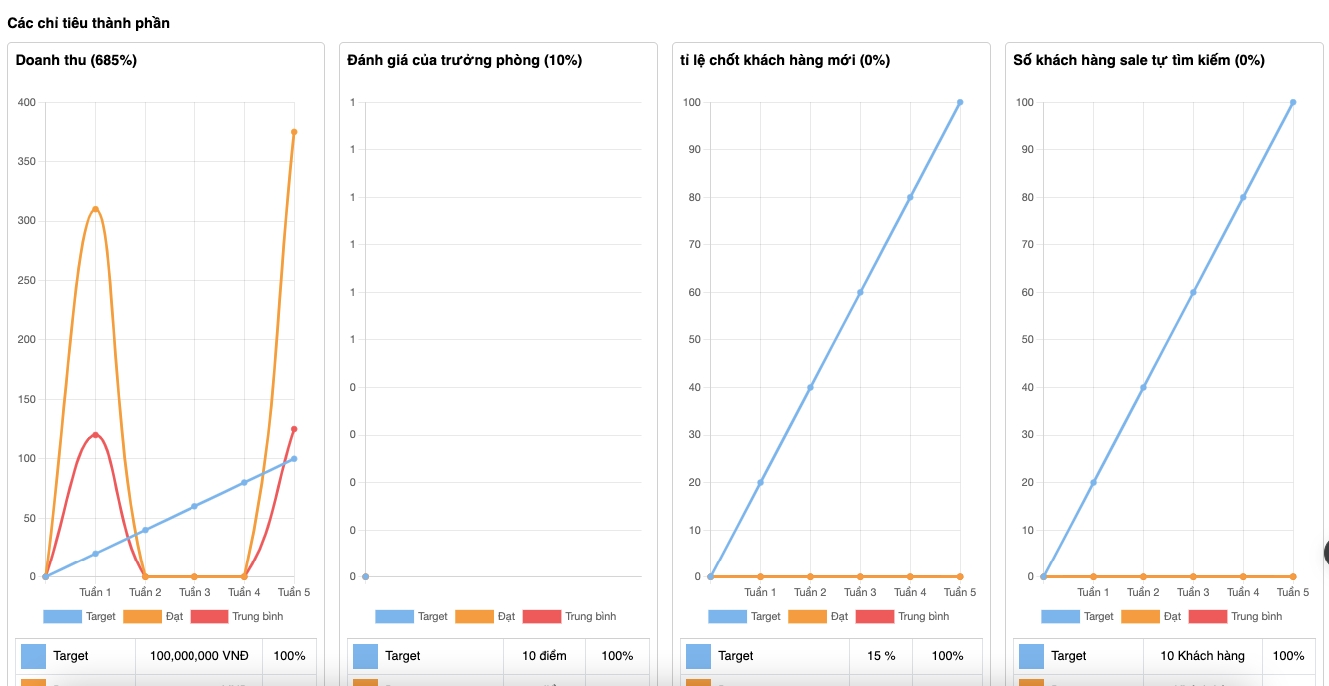 Tiếp theo, bên dưới sẽ là chi tiết biến động của từng chỉ tiêu trong danh sách KPI đang áp dụng cho nhân viên. Mỗi bảng đều hiển thị 3 thông số: Target cần đạt, Thực tế đạt bao nhiêu và trung bình chỉ tiêu của anh chị.