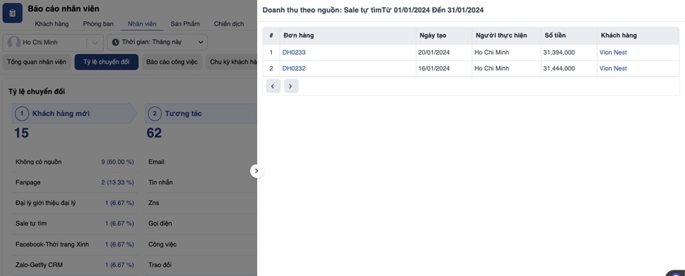 Bước 5: Doanh thu: là doanh thu trên đơn hàng và thống kê theo nguồn khách hàng.
