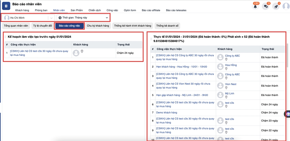 Báo cáo các công việc trong thời gian lọc. Ví dụ theo bảng bên dưới tôi đang xem báo cáo trong “Tháng này” (là tháng 1/2024) bạn có thể chọn xem theo nhân viên cụ thể: