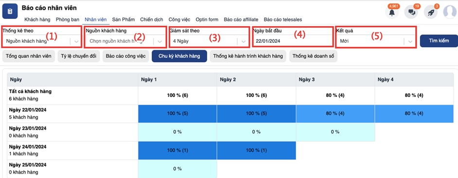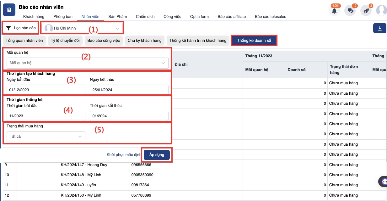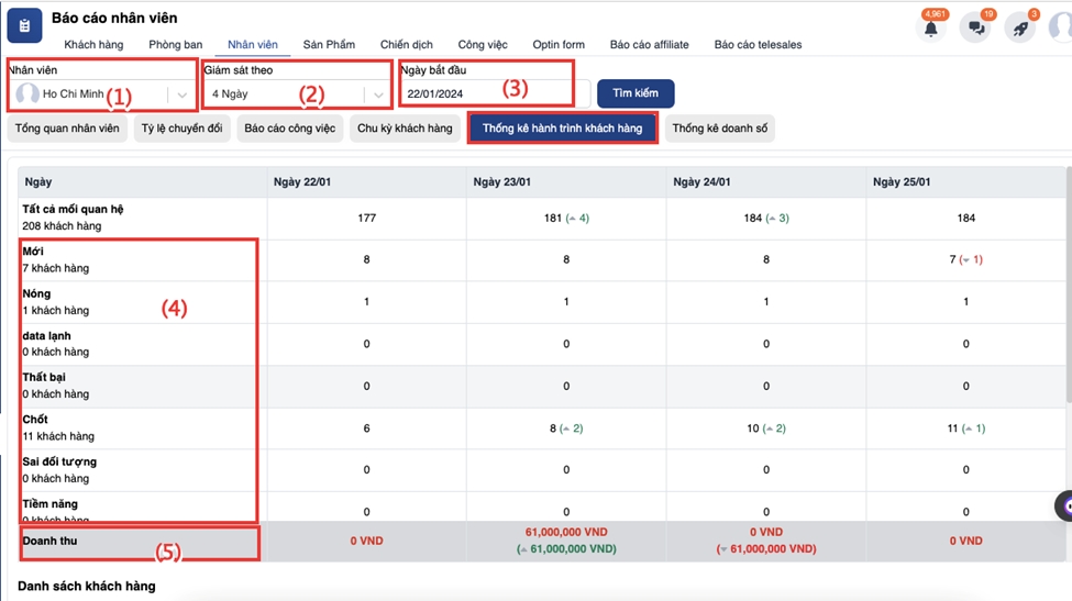 (1) Lọc thống kê hành trình khách hàng theo nhân viên phụ trách