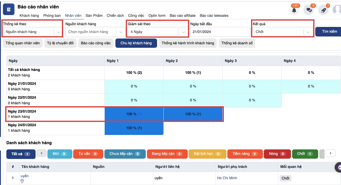Theo bảng, ngày 23/01/2024 có 1 khách hàng được tạo mới và khách này chốt được luôn trong ngày. Tương tự ngày 24/01/2024 cũng có 1 khách hàng được tạo mới và Chốt luôn trong ngày