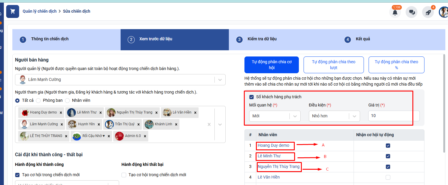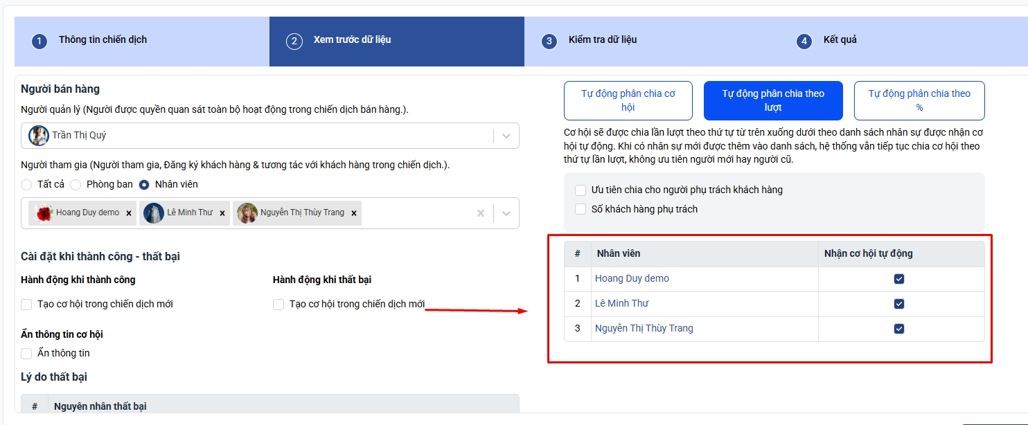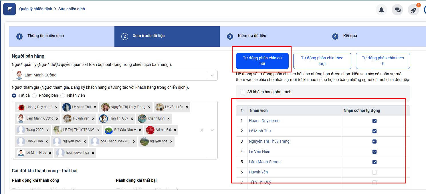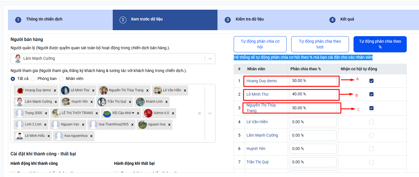 Khi chiến dịch được cấu hình chế độ “Tự động phân chia theo %”, hệ thống sẽ tự động phân chia cơ hội dựa theo tỷ lệ phần trăm đã được cài đặt cho từng nhân viên.