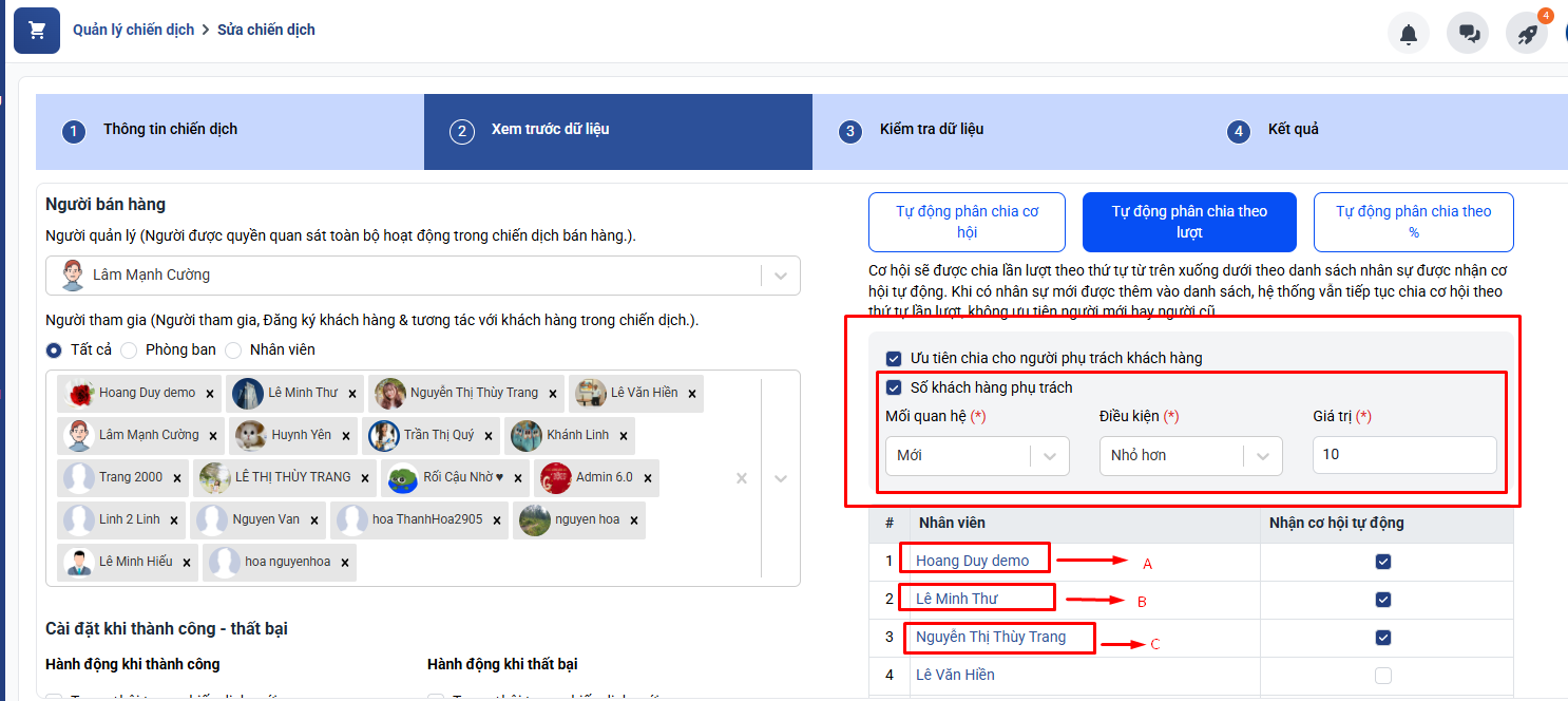 Nếu người phụ trách có trong danh sách người liên quan trong chiến dịch, hệ thống sẽ ưu tiên chia cơ hội cho người đó.