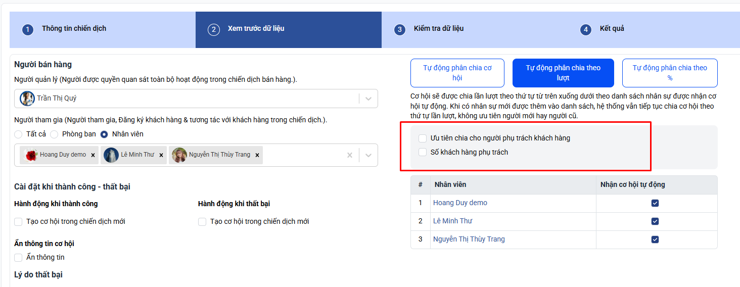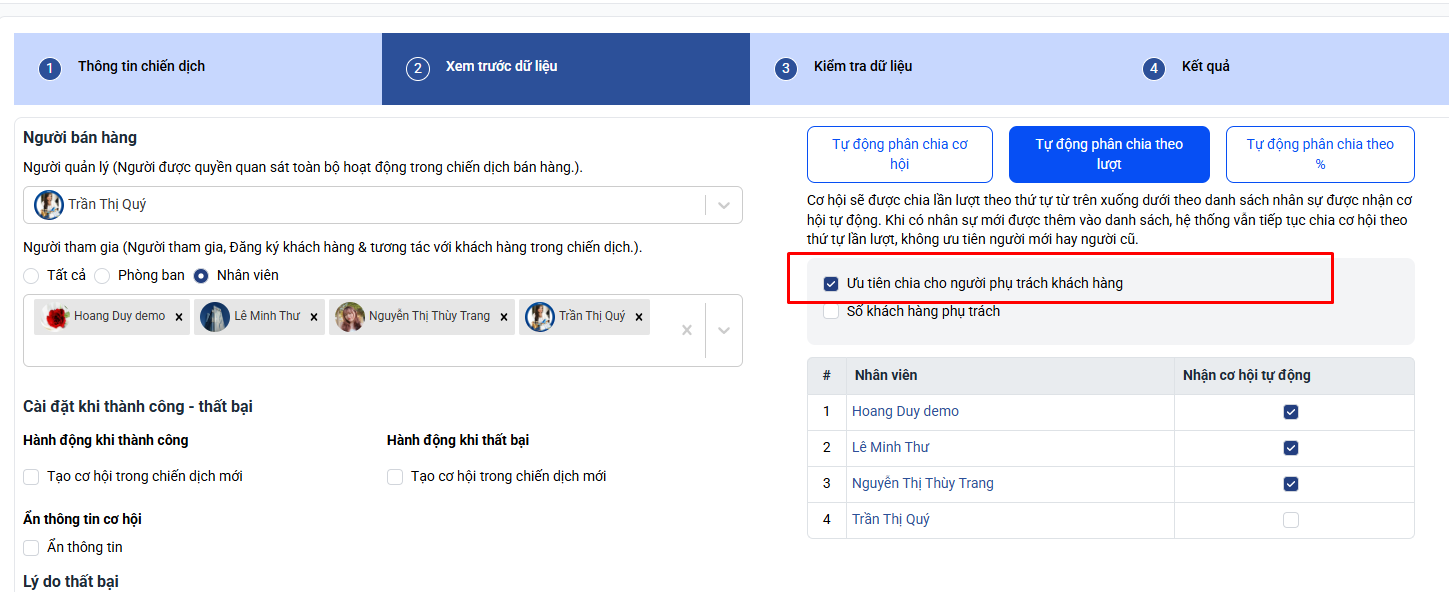 Khi được chọn cài đặt này, hệ thống sẽ ưu tiên chia cơ hội cho nhân viên đang phụ trách khách hàng tương ứng, nếu họ có trong danh sách tham gia chiến dịch.