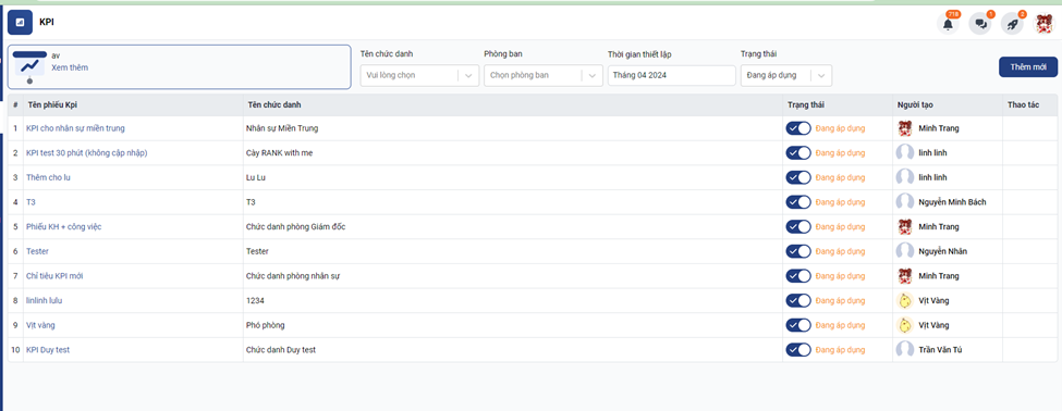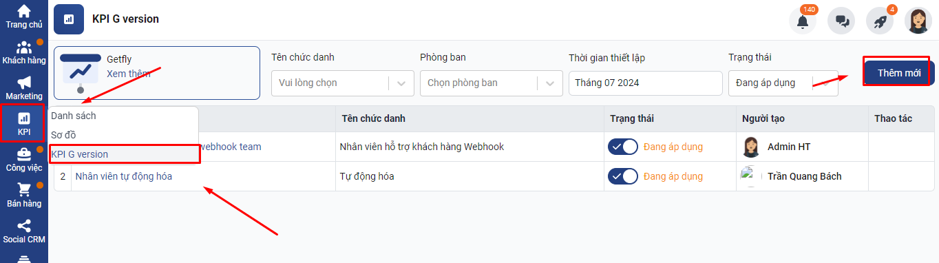 Để tạo mới KPI bạn truy cập mục KPI -> chọn KPI G version -> Thêm mới