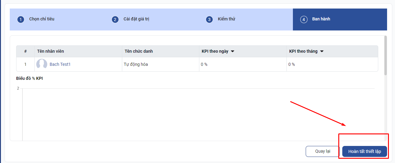 Sau khi kiểm thử nếu số liệu đã khớp bạn click Hoàn thất thiết lập để hoàn tất KPI