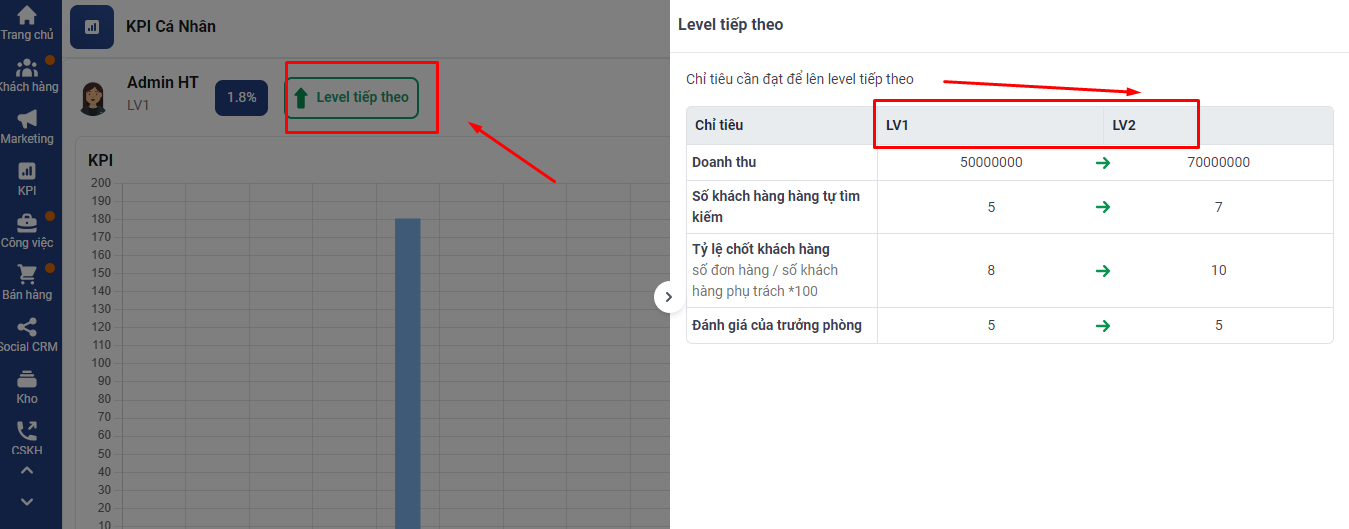 Tại KPI cá nhân có thể xem trước được thông tin các chỉ tiêu tiếp theo của level kế tiếp là bao nhiêu.