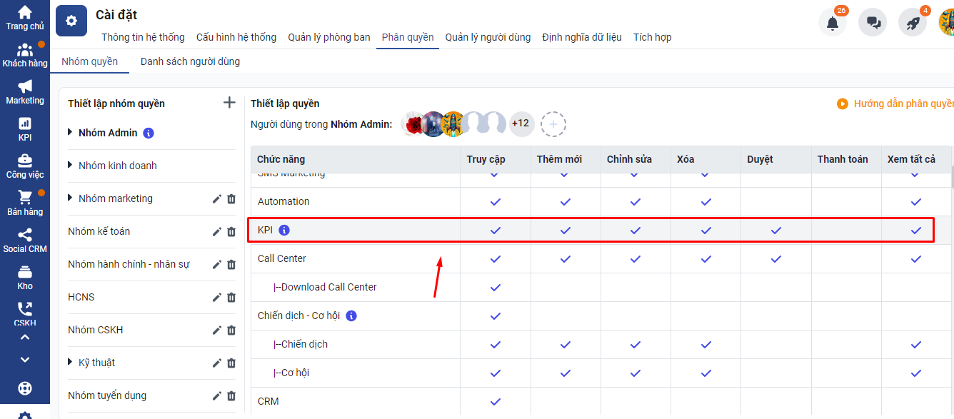 Để phân quyền cho phép người dùng giao chỉ tiêu KPI trong Getfly CRM, bạn truy cập vào Cài đặt -> chọn Phân quyền -> chọn Nhóm quyền cần bổ sung -> Tích quyền liên quan KPI