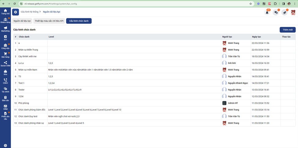 Bạn truy cập vào Cài đặt → Cấu hình hệ thống -> Cấu hình KPI → chọn Cấu hình Chức danh -> Thêm mới