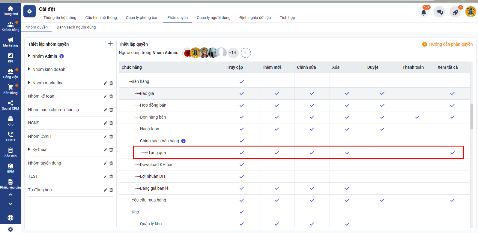 Để phân quyền chính sách quà tặng bạn thao tác vào phần Phân quyền → Chọn nhóm quyền bạn muốn phân chia và tích các quyền liên quan đến chính sách tặng quà: Truy cập, thêm mới, sửa, xóa, xem tất cả. Sau khi phân quyền truy cập bạn có thể thêm mới, sửa, xóa chính sách giá
