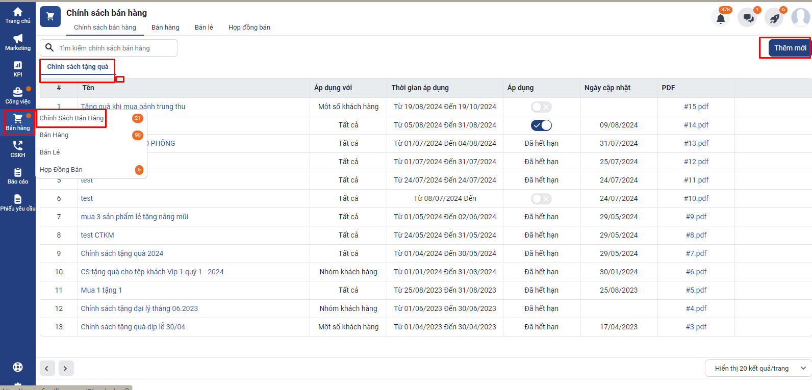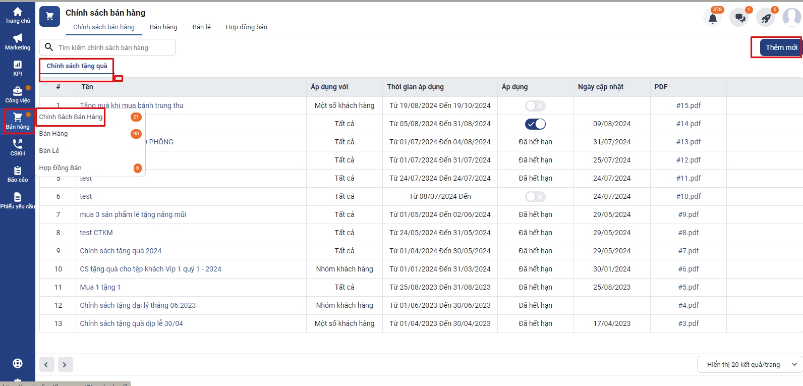 Để thêm mới chính sách quà tặng bạn truy cập vào mục Chính sách bán hàng => Chọn mục Chính sách tặng quà => Nhấn Thêm mới