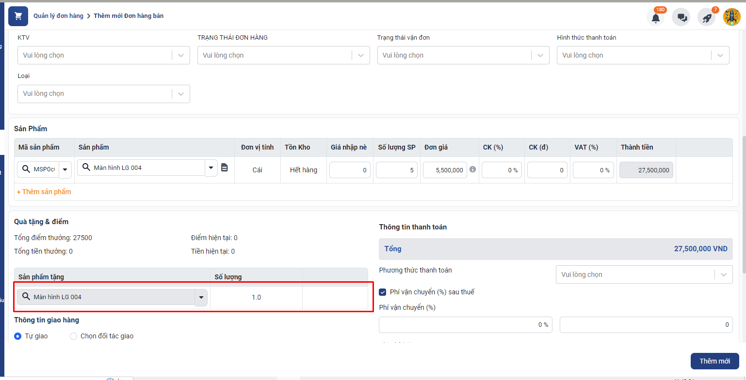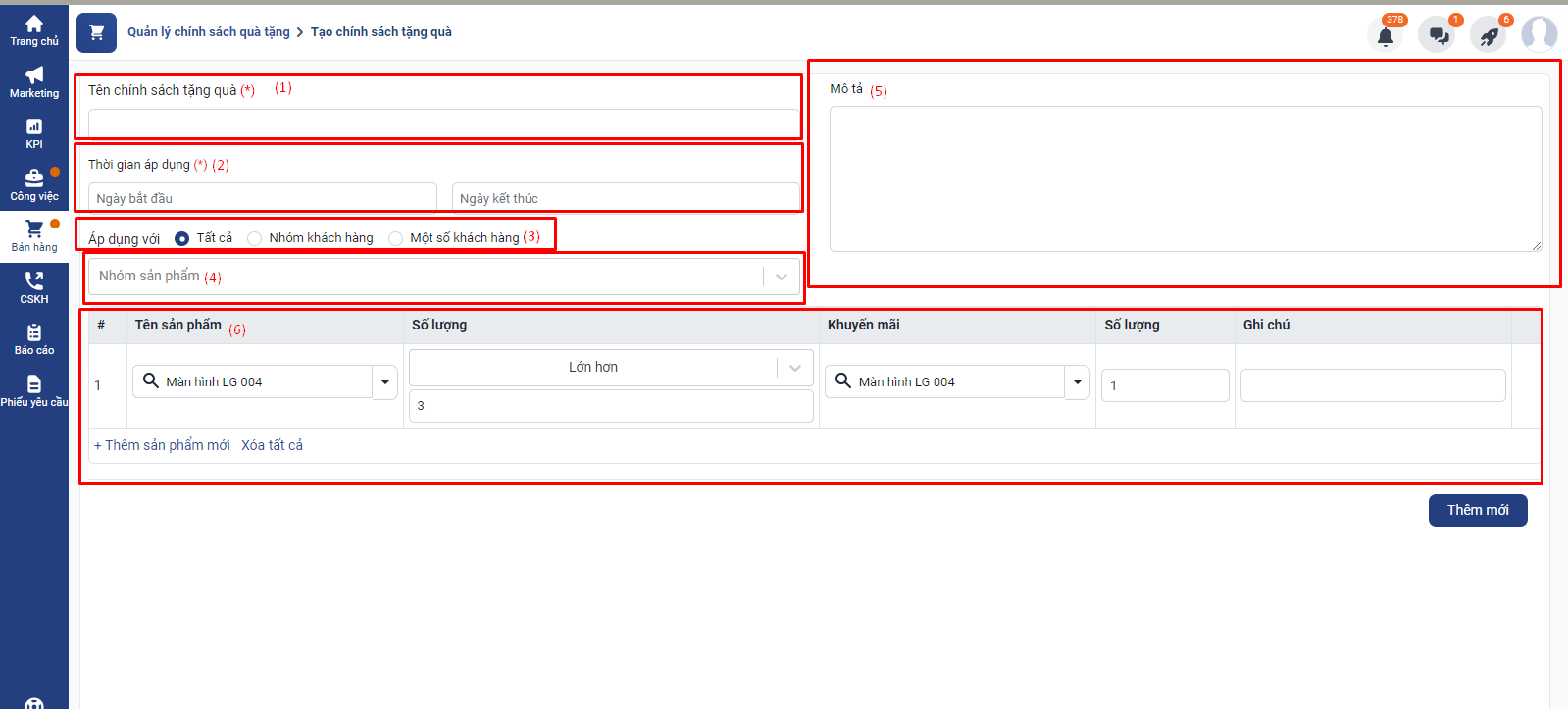 Sau khi điền đầy đủ các thông tin, bạn nhấn Thêm mới để tạo chính sách tặng quà.