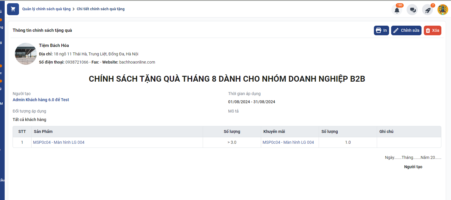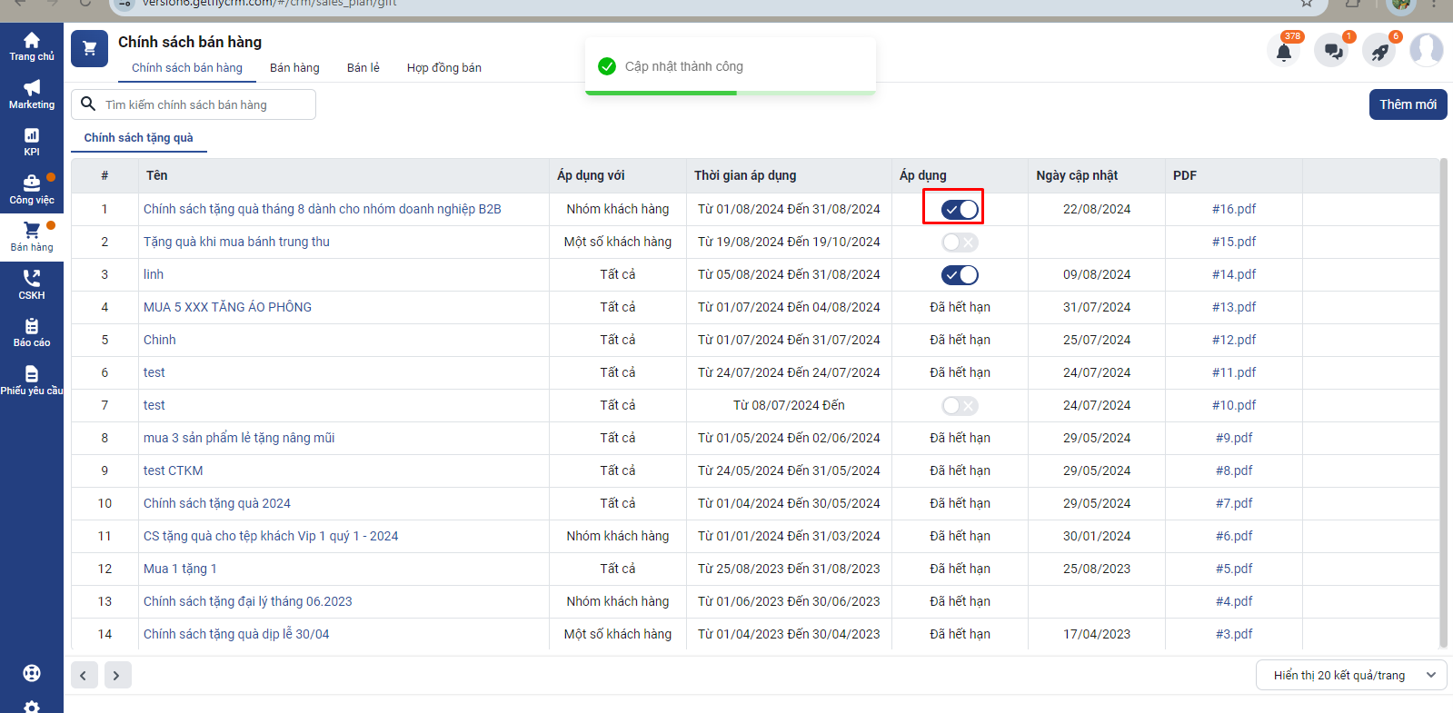 Để bật chính sách tặng quà, bạn thao tác vào lại màn hình chính sách tặng quà → bật nút áp dụng.