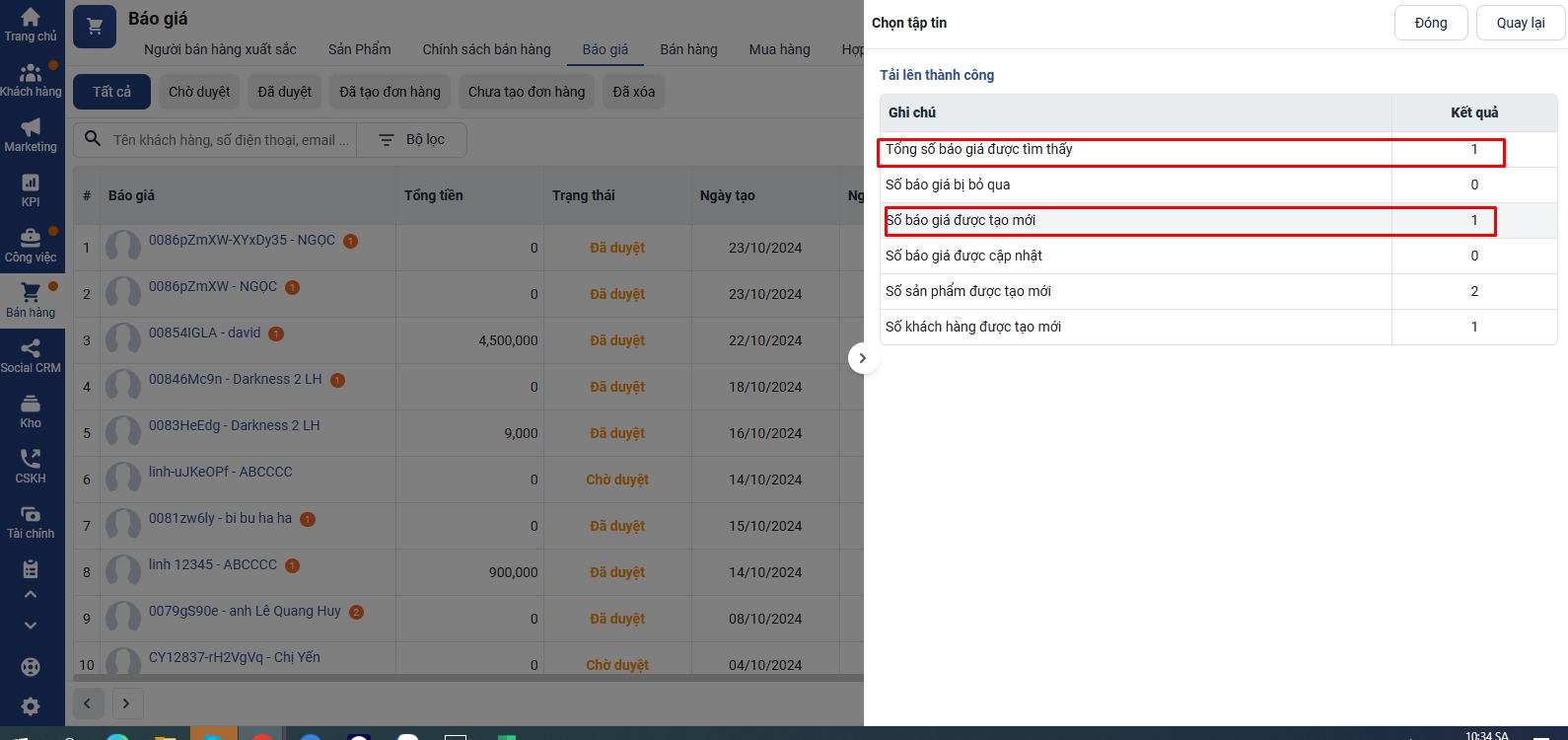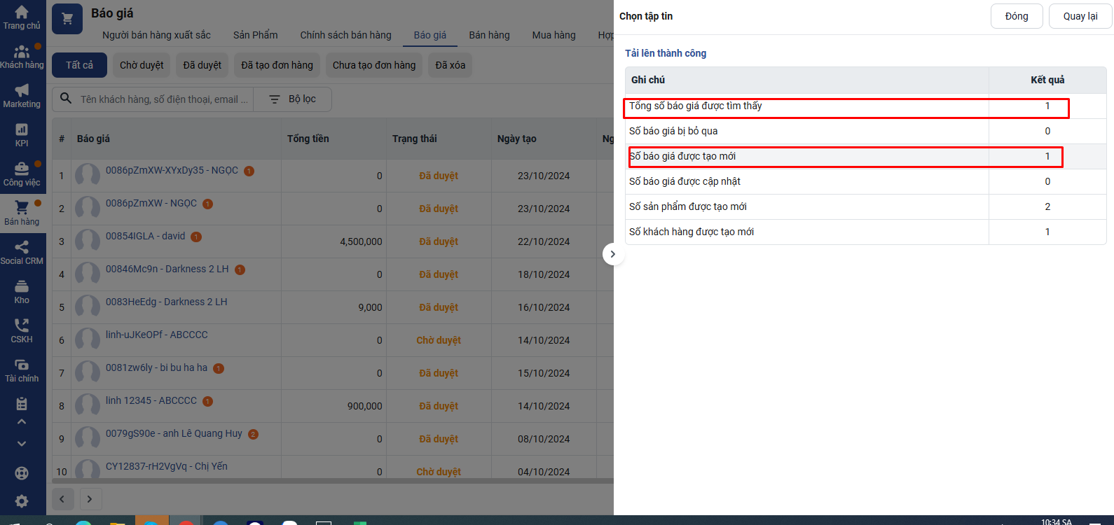 Sau khi đã check lại toàn bộ thông tin báo giá, bạn click vào Duyệt để xác nhận lại thông tin cũng như có thể thao tác tiếp theo đối với báo giá