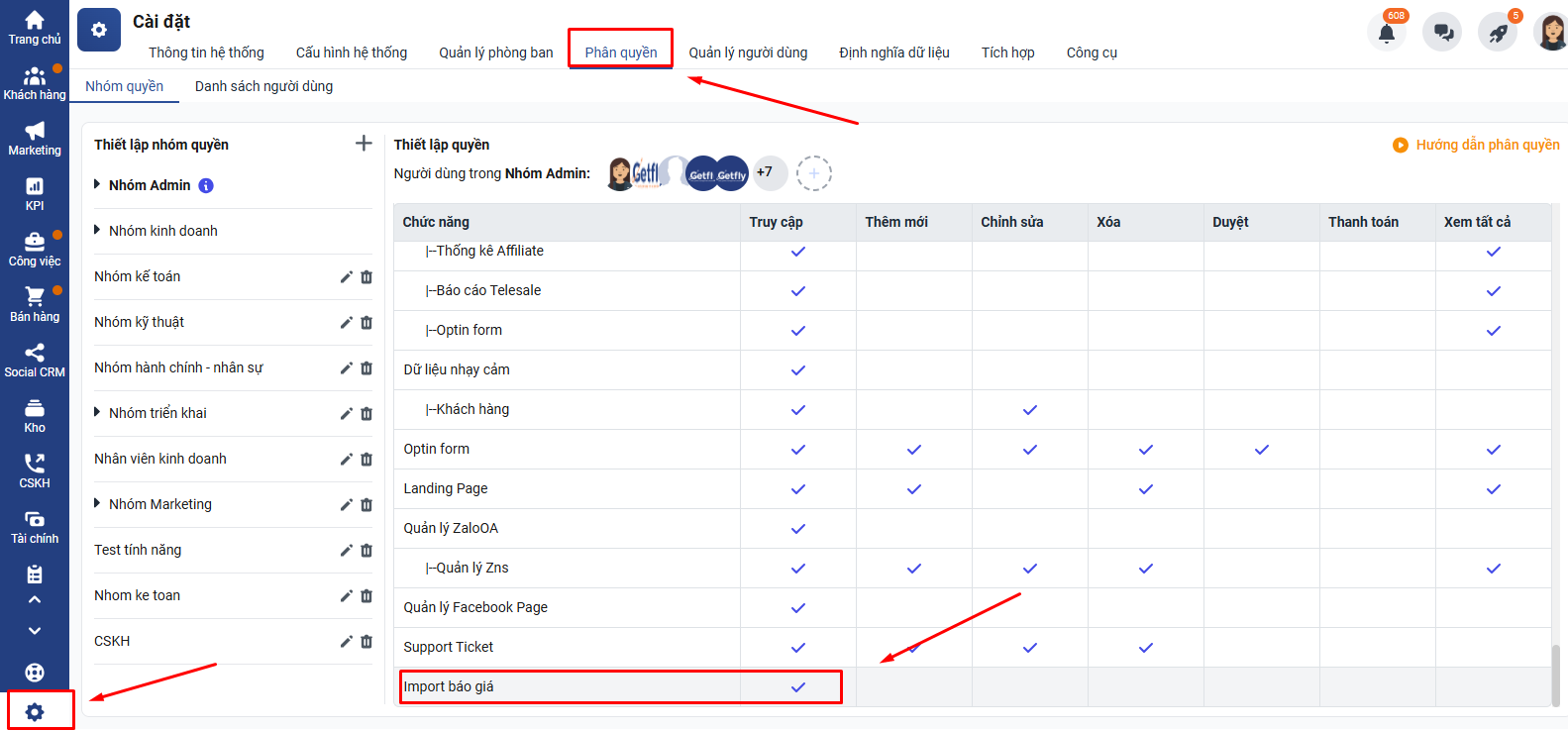 Để có thể thao tác upload báo giá, ngoài quyền Truy cập và Thêm mới báo giá, bạn cần phải được phân thêm quyền Import báo giá.