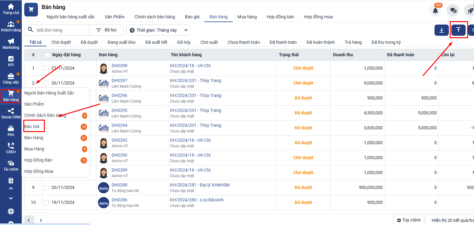 Để quản lý những báo giá đã tạo, check được trạng thái của báo giá đã duyệt hay chưa, bạn sẽ vào phần Bán hàng => chọn Báo giá