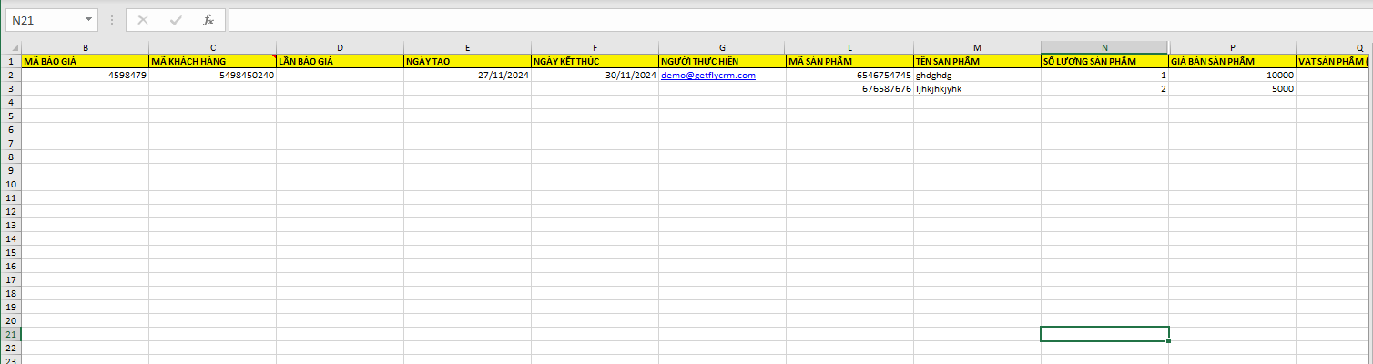 - Trường hợp trong báo giá có 1 sản phẩm: Điền thông tin sản phẩm trên 1 dòng. - Trường hợp 1 đơn có nhiều sản phẩm: + Thông tin liên quan đến báo giá và khách hàng: Ngày tạo báo giá, mã báo giá, mã khách hàng, thông tin khách hàng hàng, người thực hiện, ngày kết thúc,… : Chỉ ghi 1 dòng và ở dòng đầu tiên của báo giá. + Thông tin liên quan đến sản phẩm: mã sản phẩm, tên sản phẩm, số lượng, giá bán, chiết khấu, VAT,… ghi mỗi dòng là một sản phẩm, thẳng cột với nhau