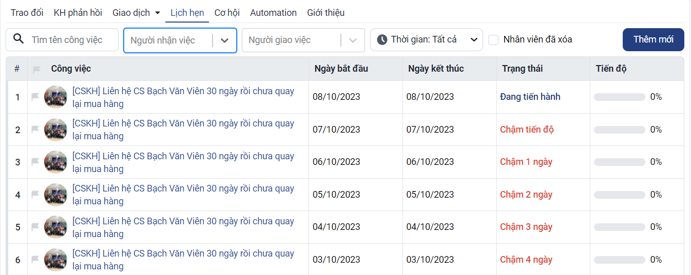 Phần lịch hẹn giúp bạn quản lý tất cả các công việc có liên quan tới khách hàng. Bạn có thể: