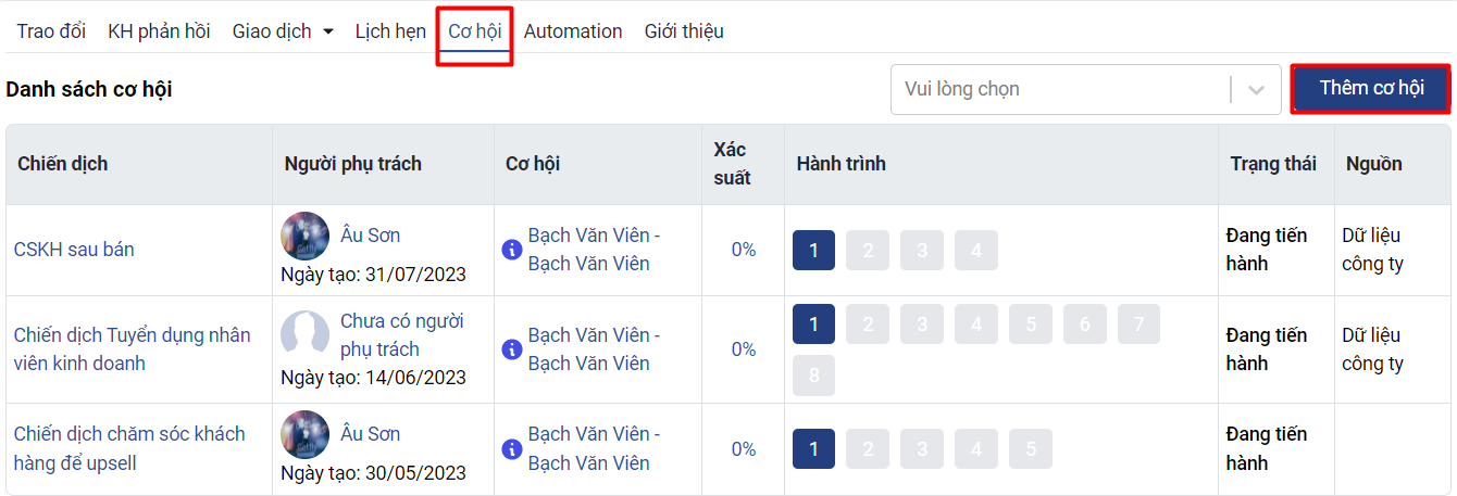 Trong tab Cơ hội sẽ hiển thị các cơ hội liên quan của khách hàng này. Bạn sẽ biết được khách hàng đang có cơ hội trong các chiến dịch nào, ai là người phụ trách và đang ở phương pháp tiếp cận nào.