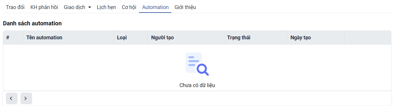 Tab Automation sẽ theo dõi được các auto đang chạy được áp dụng cho khách hàng đó. Tuy nhiên, hệ thống sẽ chỉ thống kê được với các auto được chạy với các hành động sau đây: