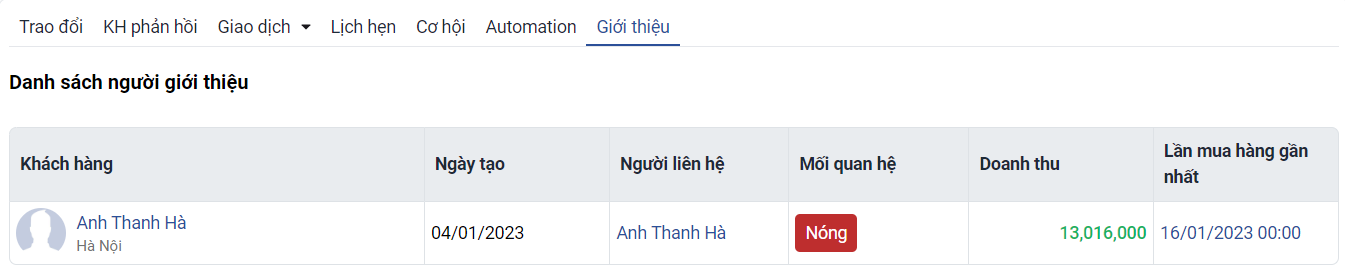 Trong tab Giới thiệu thể hiện danh sách Khách hàng được giới thiệu bởi Khách hàng đó theo dạng sơ đồ cây và chi tiết Tên, Trạng thái, Doanh thu, Ngày tạo của khách hàng được giới thiệu.