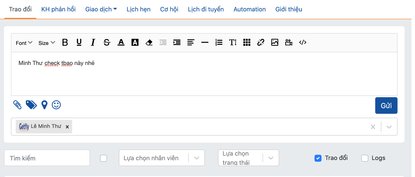 Bạn ghi nhận lịch sử trao đổi với Khách hàng tại tab Trao đổi và nhấn Gửi: